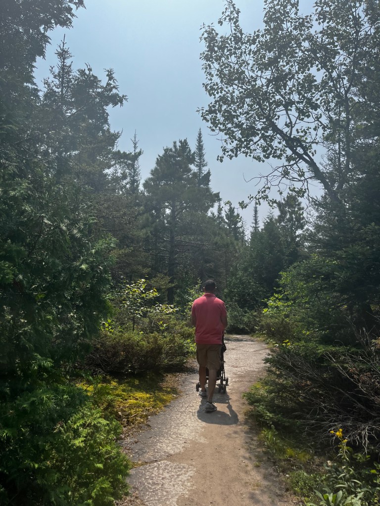 Thanks to our friendly innkeeper at the Manitoulin Inn who recommended Misery Bay Provincial Park for its kid-friendly hiking trail. So after a leisurely next morning and a long wait for a mediocre breakfast at the popular Mum’s Restaurant & Bakery in Mindemoya, we finally arrived at Misery Bay in the late afternoon. The sun was blazing hot by then, and I was glad to have been fully prepared for it with hats, sunglasses, gatorade and a light stroller for my son to sit on if he got tired.