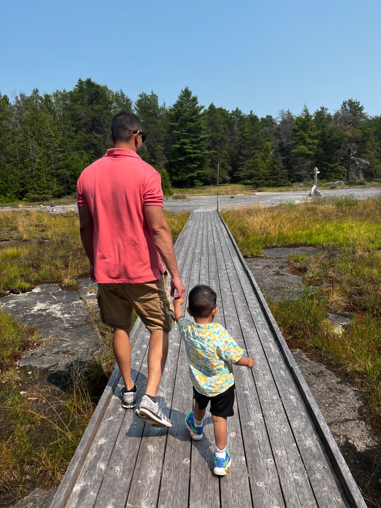 This July, we loaded our car with toys and snacks, our ice box with yogurt cups, cheese sticks, Hawaiian rolls, apple sauce pouches and our phones with many episodes of Ms Rachel and Cocomelon, and set out to Manitoulin Island. You can dive into the details of day one of our journey in my Manitoulin Island travelogue. Another helpful item to pack is a plush toy and blanket. My toddler tends to tip his head to the side when napping in the car seat and the plush toy helped relieve his neck while sleeping.